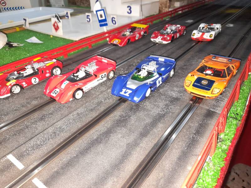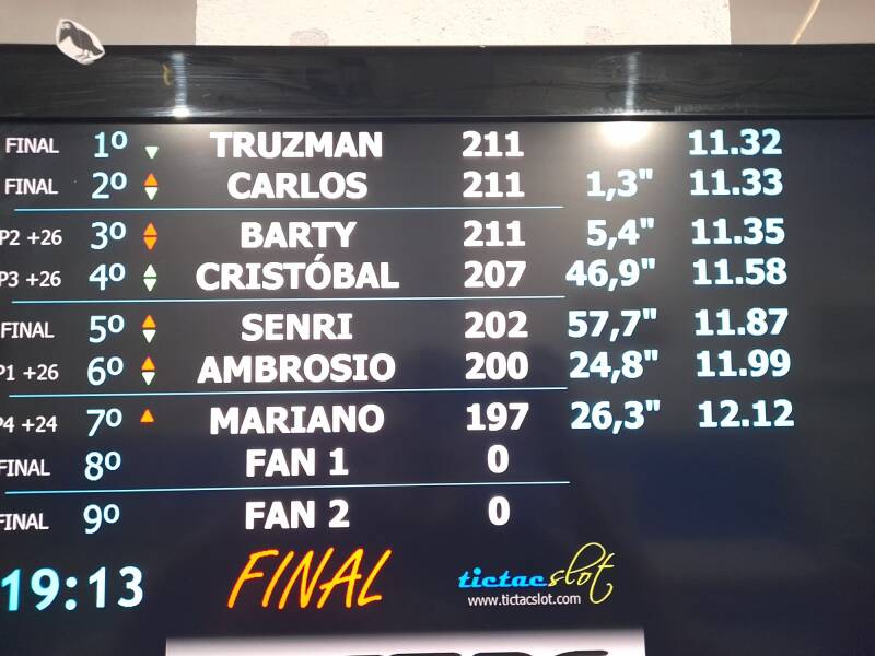 Comenzamos las verificaciones puntualmente y sin ninguna incidencia reglamentaria. Todo en orden. Damos inicio a la pole y es aquí cuando empiezan a saltar las sorpresas. Únicamente 3 pilotos son capaces de bajar de los 11 segundos, siendo uno de ellos Senri (10,84). Le está cogiendo el gustillo a clasificar en las primeras posiciones y poniéndole las orejas tiesas a más de uno (a mí por ejemplo). Senri, me estás cayendo mal!!! Otro piloto que consiguió bajar de la barrera psicológica de los 11 segundos fue Carlos, que con su tiempazo de 10,76 ya se veía como el poleman de la tarde y presentaba sus credenciales como favorito a la victoria. Pero es entonces cuando irrumpe Barti en la pista con un estratosférico y sorprendente crono de 10,73. Ver para creer!!! El nivel está subiendo en este humilde club y las poles hay que pelearlas como si no hubiese un mañana. El resto de pilotos se reparten las demás posiciones y damos así inicio a la carrera. Sorprende ver a Cristóbal en el penúltimo lugar de la parrilla. Tal vez a su apuesta con el Ford MKII 3 le faltó una mejor preparación. Con su cómoda ventaja en la general se puede permitir ciertos lujos al alcance de muy pocos. Arrancó con problemas de potencia y su cara delataba que no iba a ser una carrera tranquila. Sus primeras vueltas fueron muy lentas hasta que consiguió estabilizar su coche en unos tiempos bastante discretos para lo que nos tiene acostumbrados. Comenzó a recortar la desventaja que llevaba con Mariano y Ambrosio hasta poder superarlos holgadamente. Ambos marcaban un ritmo constante pero no lo suficientemente rápido como para dar guerra por arriba. Al amigo Ambrosio se le echó en falta la explosividad que suelen llevar sus bólidos. Como él bien decía, llevaba un coche atmosférico. Esperemos que para la próxima cita venga con el turbo reparado y poder dar más batalla en el circuito. A Mariano la carrera se le hizo un poco cuesta arriba desde el principio. Tenía pocas salidas pero su conducción conservadora le impedía aspirar a mejores resultados. Tiene que arriesgar un poco más para escalar posiciones y él lo sabe. Después de este grupo de pilotos es el turno de Truzman. Comienza haciendo onces bajos en sus primeros giros y difícilmente llegaba a los 10 altos por vuelta. Un par de salidas comprometían su presencia en el podio, ya que los 3 primeros clasificados iban más rápido que él como se pudo comprobar a posteriori. Senri llevaba un ritmo endiablado y le ponía las cosas bastante difíciles, pero varias salidas de Senri hicieron bastante mella en él y empezó a desinflarse. Si consigue concentrarse puede dar mucha guerra como ya lo hace últimamente en las poles. Su progresión está siendo ascendente y se está volviendo un hueso duro de roer. Seguidamente entra Carlos en acción y se nota que tiene hambre de victoria. Su ritmo constante de 10,80 infunde miedo en sus rivales, pero varias salidas desafortunadas confirman que la potencia sin control no sirve de nada, ya que Barti (el tapado de la tarde), empezó a dar un recital de vuelta rápida tras vuelta rápida y lo mejor de todo, !sin salirse! Termina la primera manga en primera posición y con una seguridad y confianza pasmosa. Lo tenía todo bajo control y era su día. Pero como ya se sabe, las carreras no son como empiezan sino como terminan. En la segunda manga Truzman aprieta el ritmo y sin ser el más rápido, empieza a meter presión a Barti y a Carlos, ya que hace buenos tiempos sin apenas salidas y termina con 211 vueltas su participación. La presión está servida. Carlos y Barti saben que no pueden bajar la guardia y aunque van por delante de él, tienen que ser constantes. Barti pega un bajón en la pista 4 y su ventaja se desvanece prácticamente por completo en un abrir y cerrar de ojos. Carlos huele la sangre y aprieta aún más si cabe hasta completar 211 vueltas, aunque insuficientes para dar alcance a Truzman que se escapa vivo por apenas un metro. Las salidas prematuras de Carlos en la primera manga le privaron de la victoria. Barti en su último carril sufre varios percances que le hacen perder la poca ventaja que tenía relegándolo a la tercera posición. Es una pena que todo se vaya al garete en los dos últimos carriles. Cristóbal consolida su cuarta posición y salva los muebles dado el mal augurio que presagiaba su mecánica al principio de la prueba. Senri termina quinto superando las 200 vueltas, seguido de Ambrosio y Mariano. Felicidades a Cristóbal por conquistar la categoría de clásicos GT Le Mans y agradecer a todos los pilotos su participación, destacando que la victoria puedo caer en manos de cualquiera de los 3 de arriba. Esta vez se la llevó Truzman, que a pesar de no ser el más rápido en la pista, tuvo el premio gracias a su regularidad y escasas salidas en el último tramo de la carrera. Con todo el pescado vendido, damos paso a nuestra tradicional 3ª manga para comentar lo acontecido entre aperitivos y refrigerios varios.